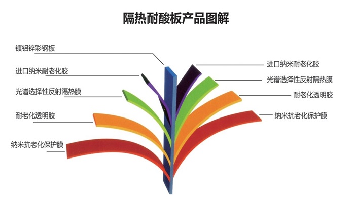 1. 九層采用納米抗老化保護(hù)膜;2.八層為耐老化透明膠:3.七層為光譜選擇性反射隔熱膜:4.六層為進(jìn)口耐老化膠:5.五層為彩鋼瓦。