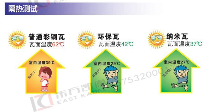 夏天彩鋼層頂表面溫度能達(dá)63°C,高溫的彩鋼板會(huì)使大量熱能向屋內(nèi)傳導(dǎo)、室內(nèi)溫度升高、氣溫可達(dá)40°C 隔熱耐酸板表面粘附的光譜選擇性反射隔熱膜(俗稱:多重磁控濺射膜),能選擇性的將陽(yáng)光中的各種熱能源、紅外線、紫外線以及可見(jiàn)光熱能反射,反射率達(dá)85%,隔熱彩鋁板和普通彩鋼板隔熱性能對(duì)比實(shí)驗(yàn)表明:隔熱耐酸板表面溫度遠(yuǎn)低于普通彩鋼板,室內(nèi)溫度比普通彩鋼板低8度,具有高效隔熱性能。